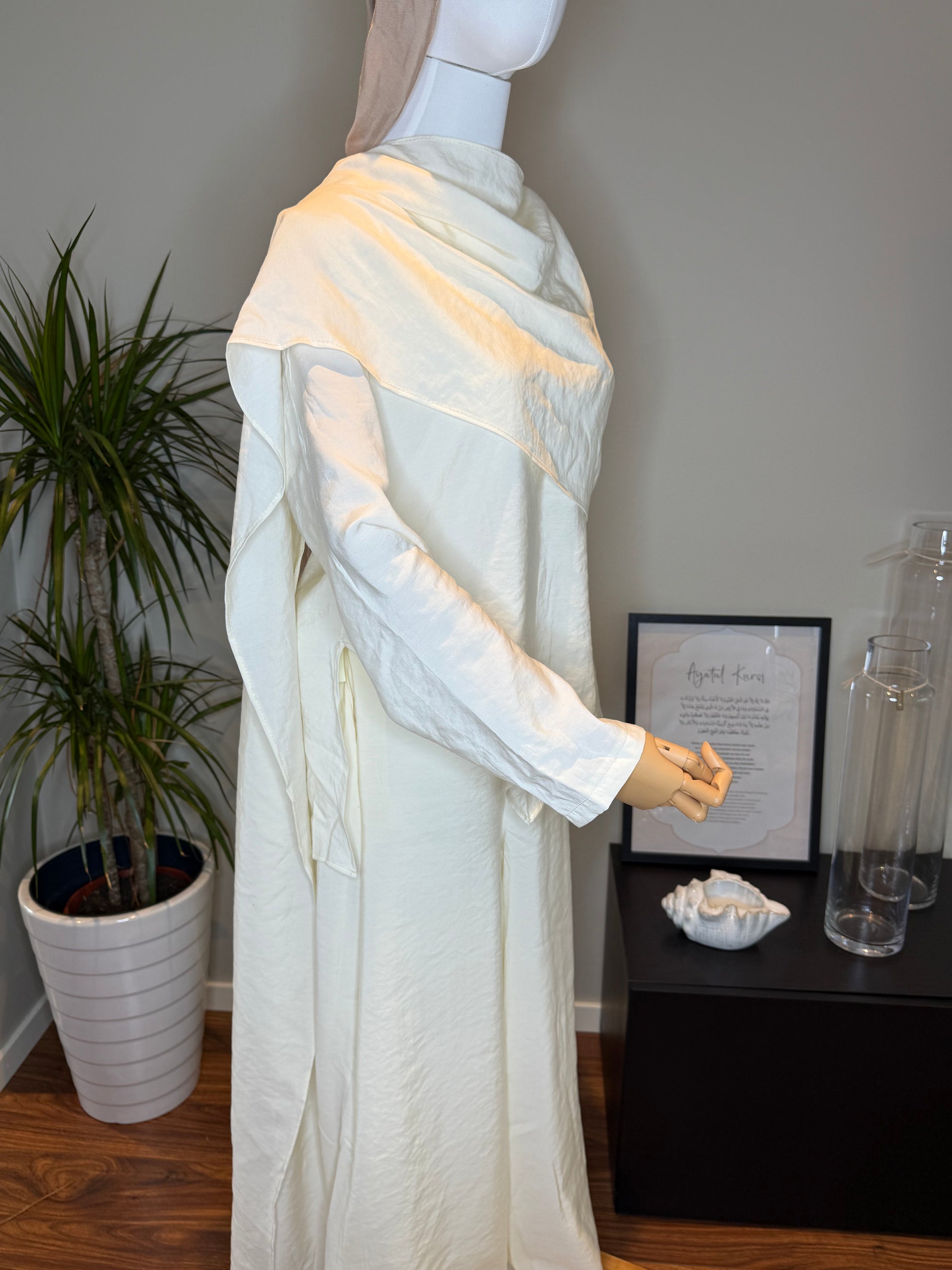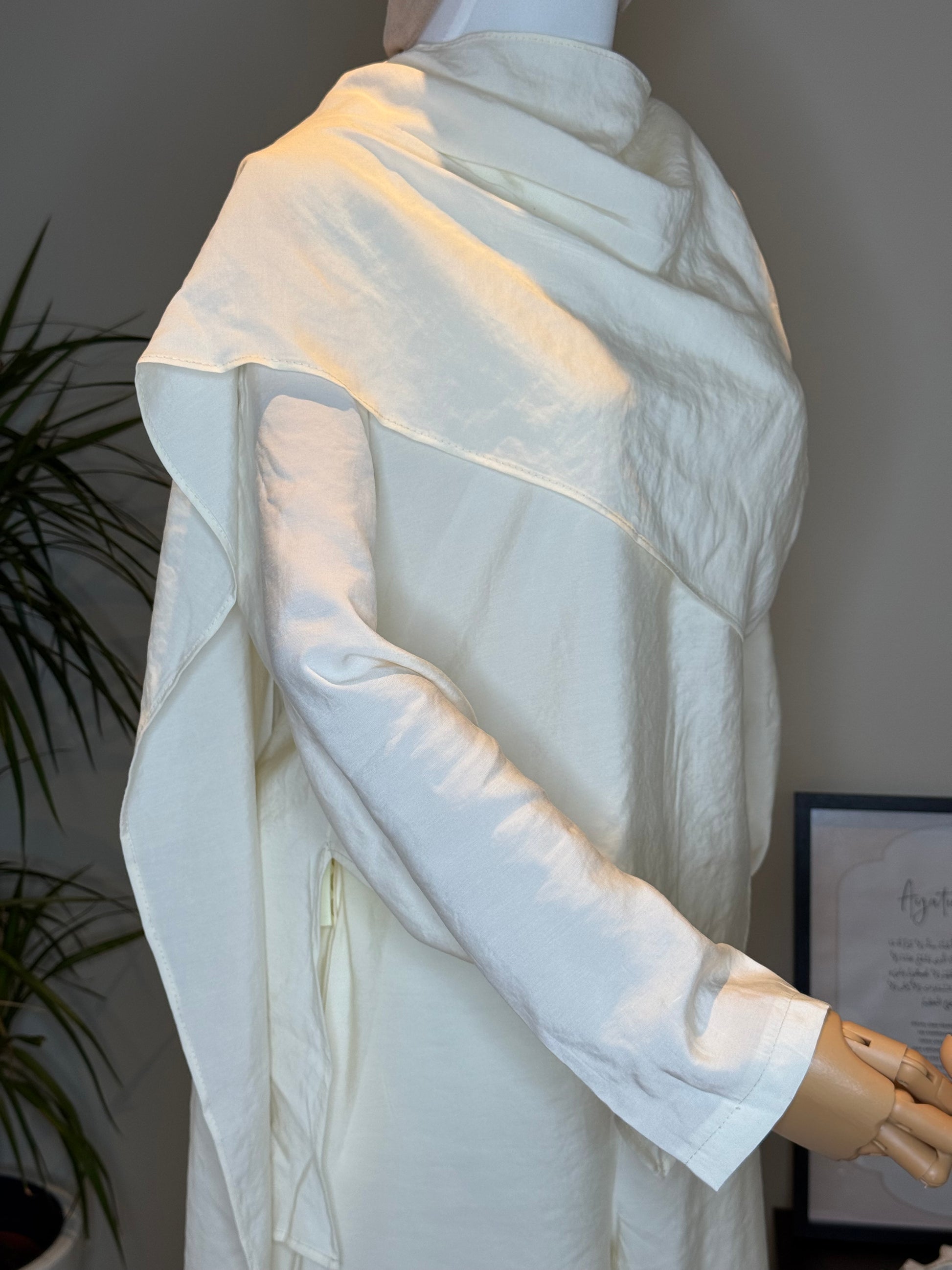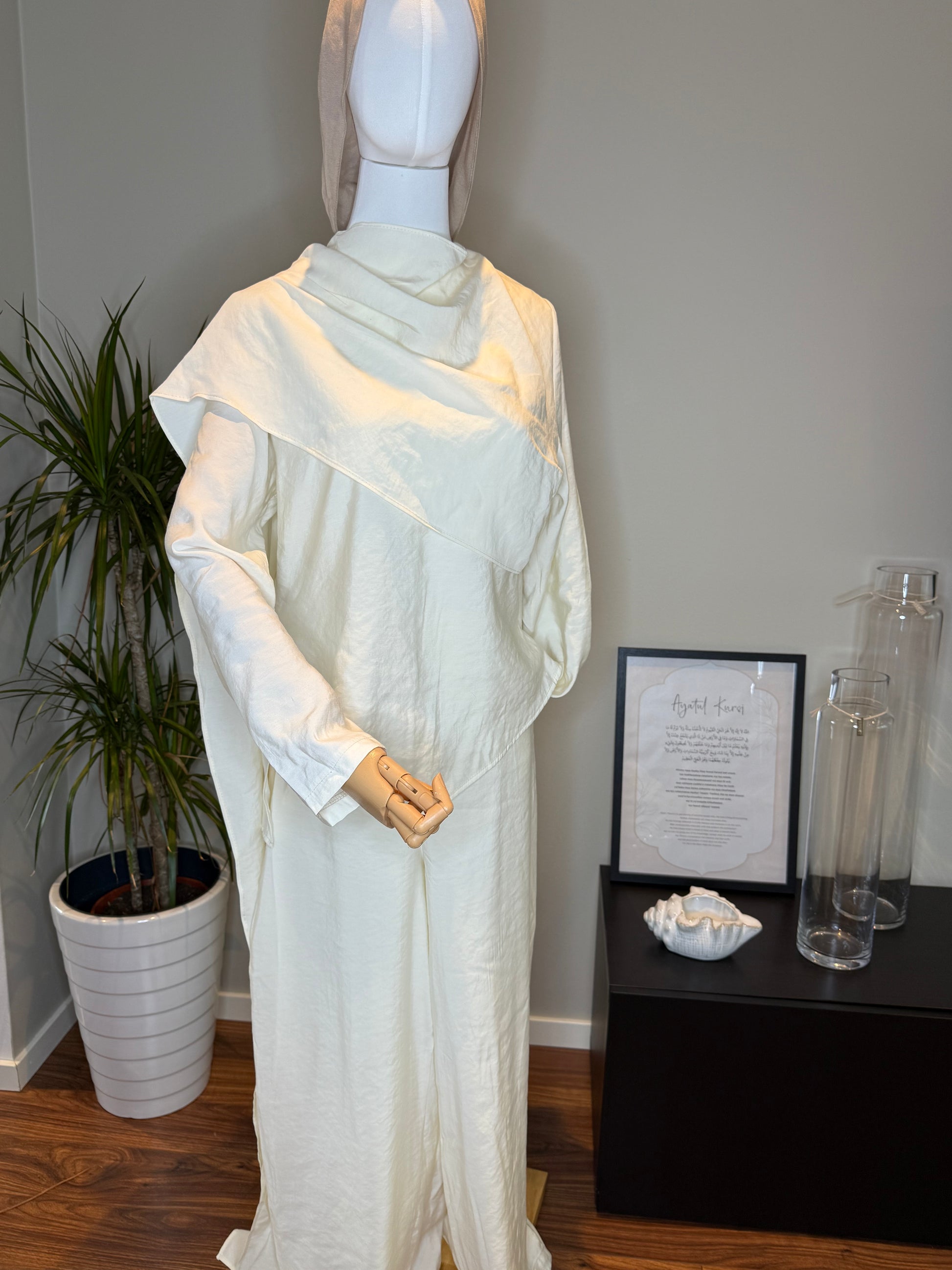 Det här eleganta setet kombinerar bekvämlighet med stil på bästa sätt. Byxorna har praktiska fickor och en skön passform som gör dem perfekta för både vardag och fest. Toppen är detaljrik med en spetsig fram- och baksida, en snygg kedja i sidan och ett fastsytt draperi som löper från ena axeln, över bröstet och till andra axeln. En modern och unik design utan att kompromissa med modesty.
