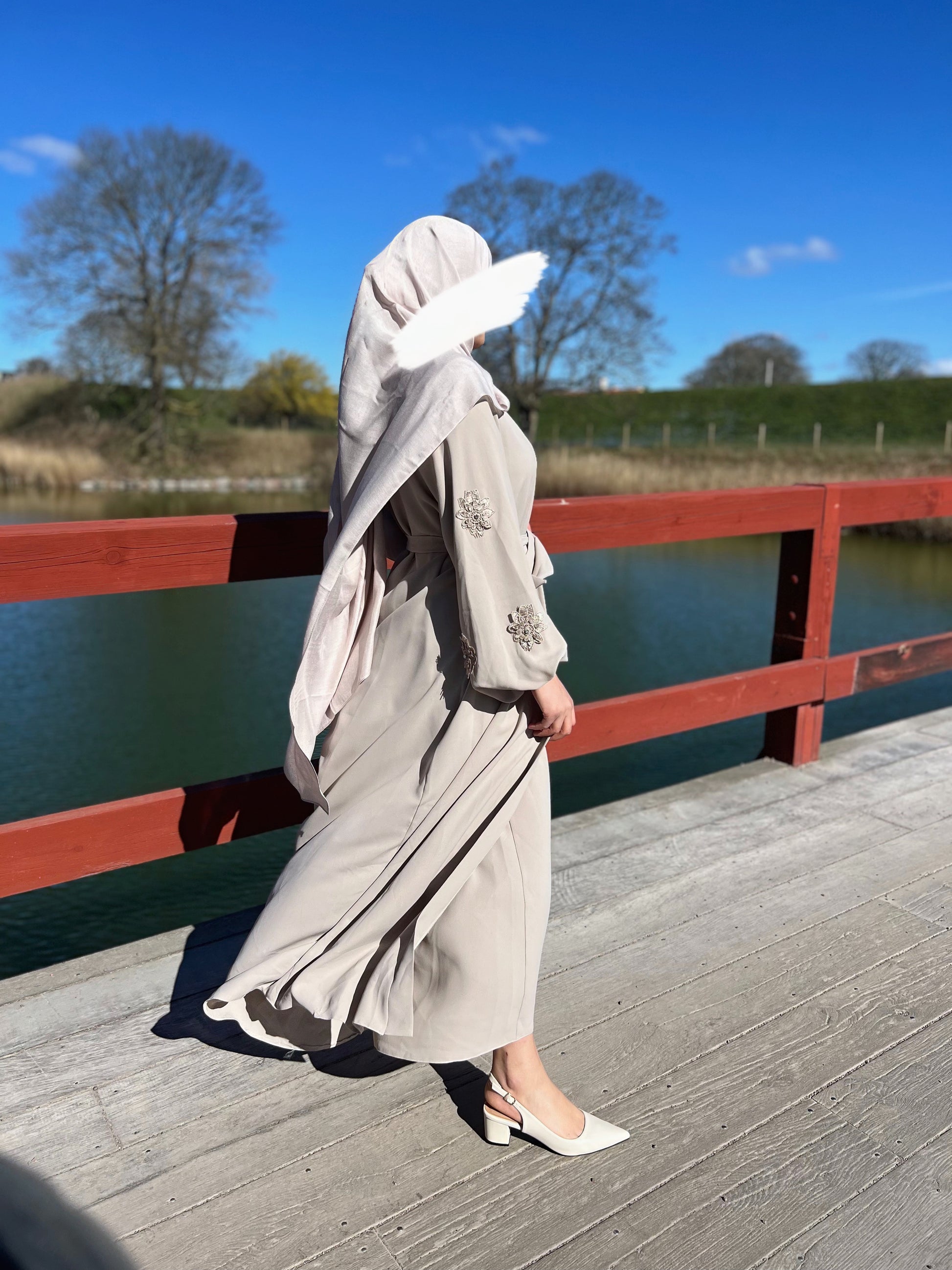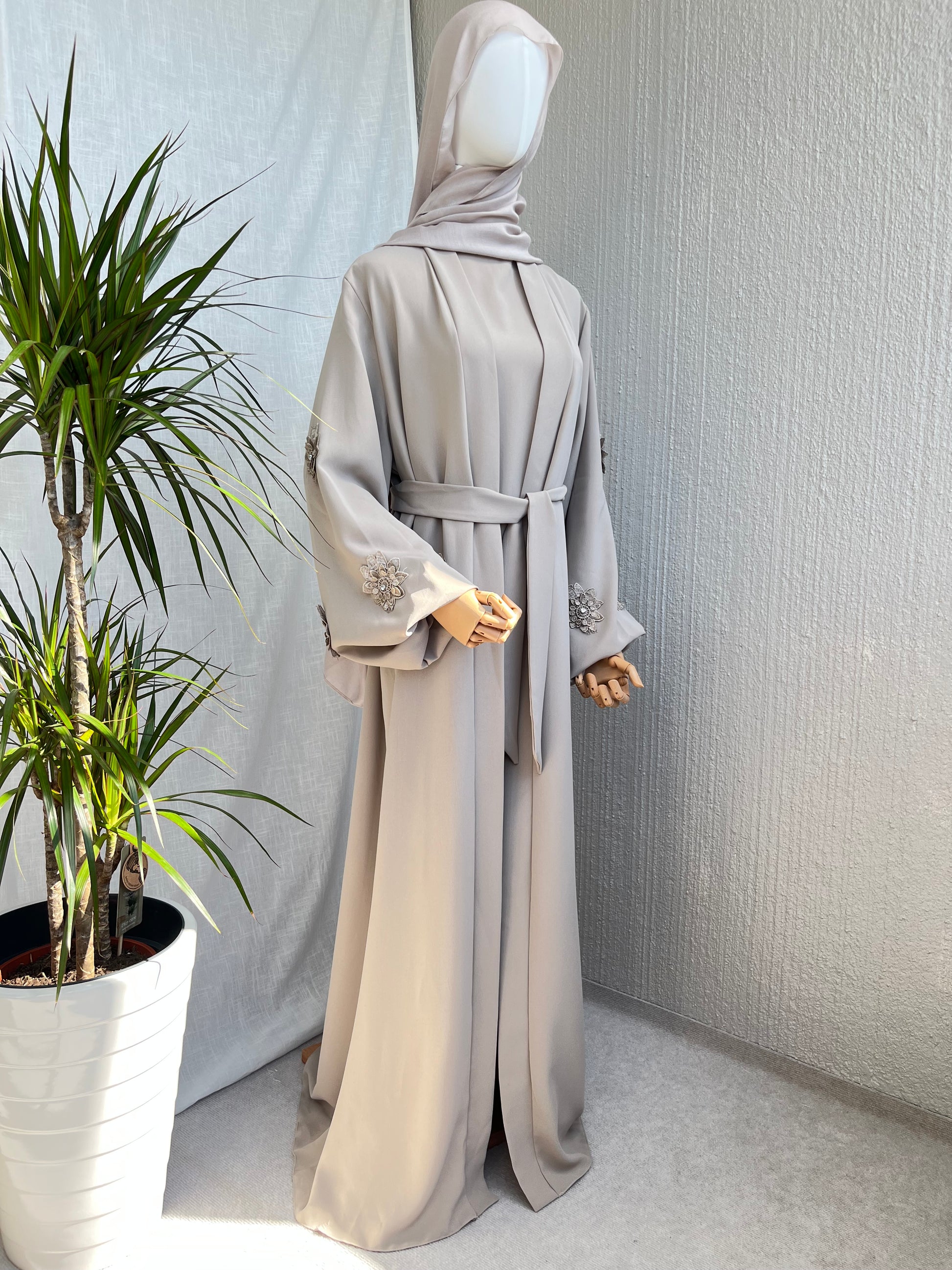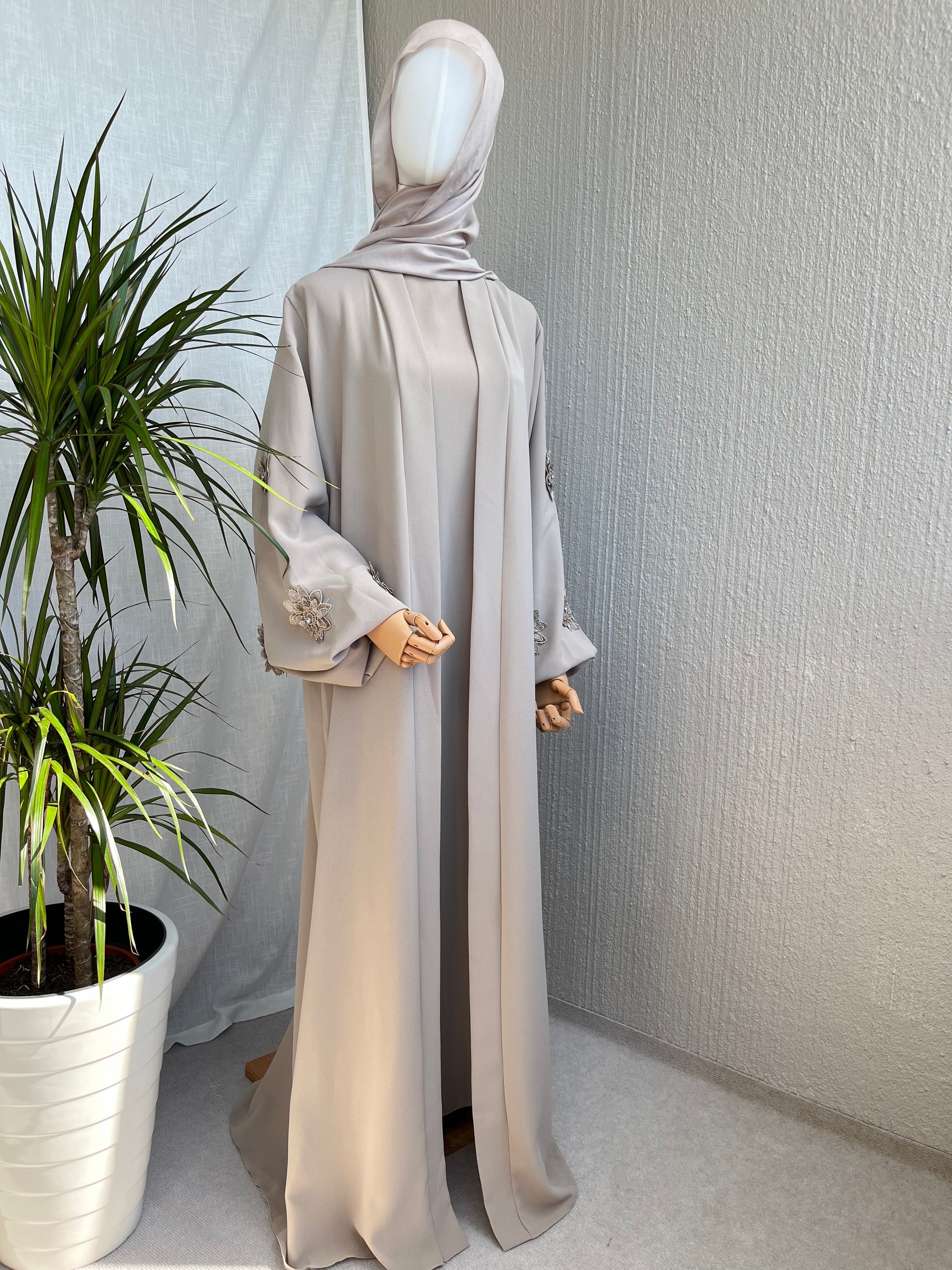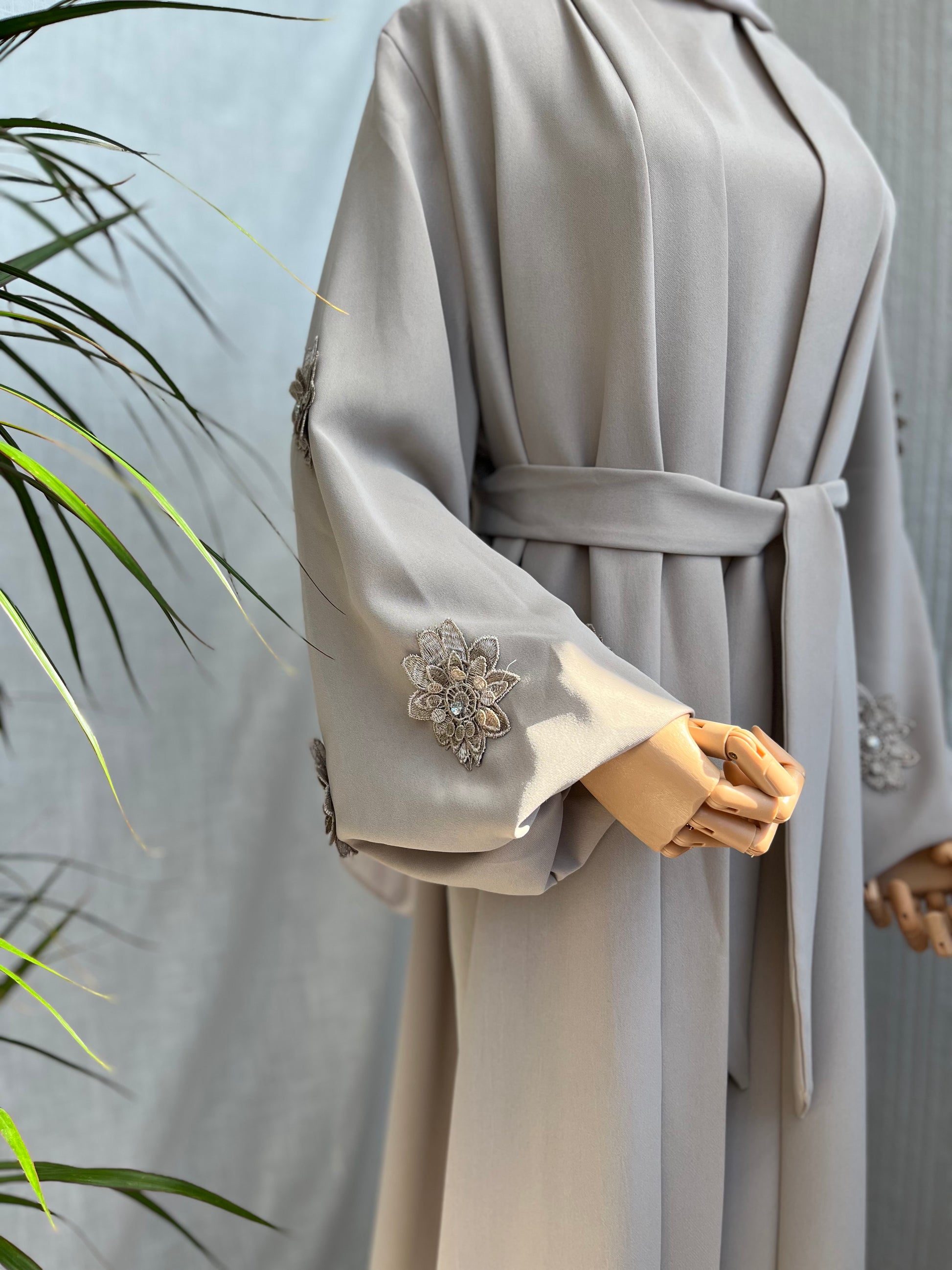 Denna vackra abaya består av två delar: en lång underklänning med ärmar som slutar vid axlarna och en öppen abaya med eleganta blomdetaljer vid ärmsluten. Abayan har ballongärmar som ger en mjuk och feminin look. Setet kommer med ett matchande bälte för att ge en extra elegant finish. En perfekt outfit för både vardag och fest.