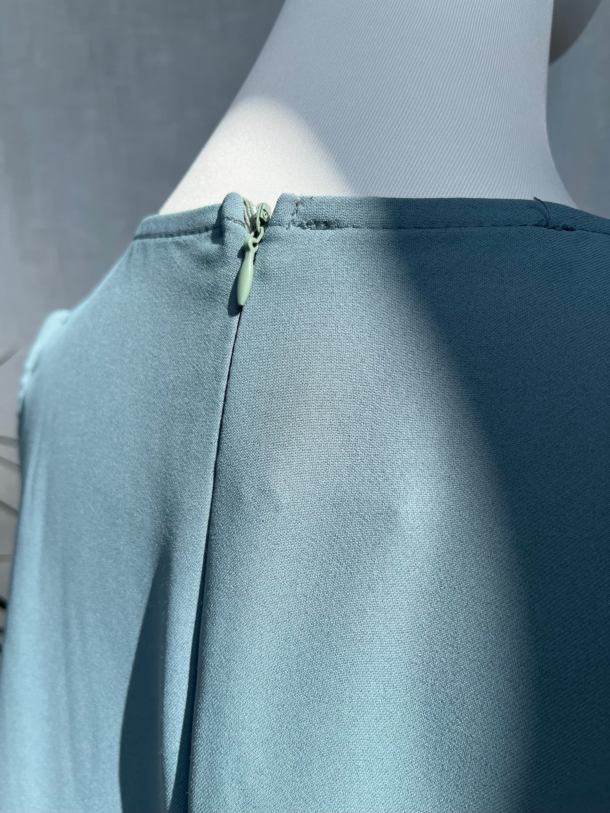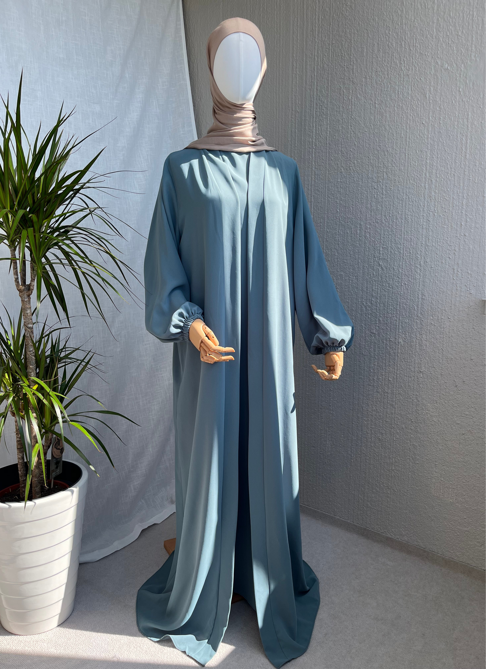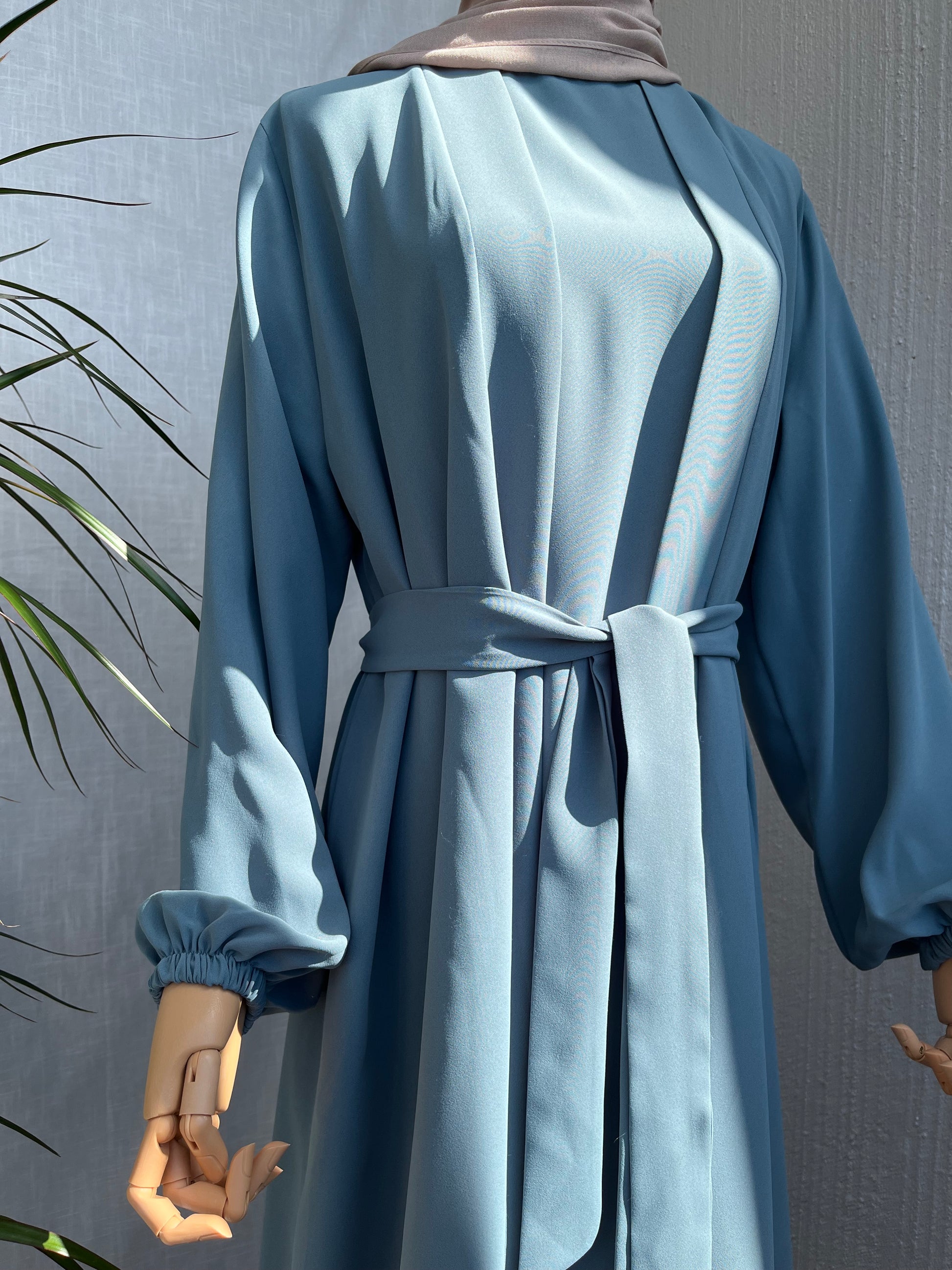 Denna abaya i en behaglig grön nyans är bekväm, perfekt för varmare dagar eller som ett elegant plagg för flera tillfällen. Setet består av två delar: en lång underklänning med korta ärmar som slutar vid axlarna, och en lång, öppen abaya som ger ett luftigt och stilfullt intryck. Abayan kommer med ett matchande bälte för att ge en elegant finish till looken.