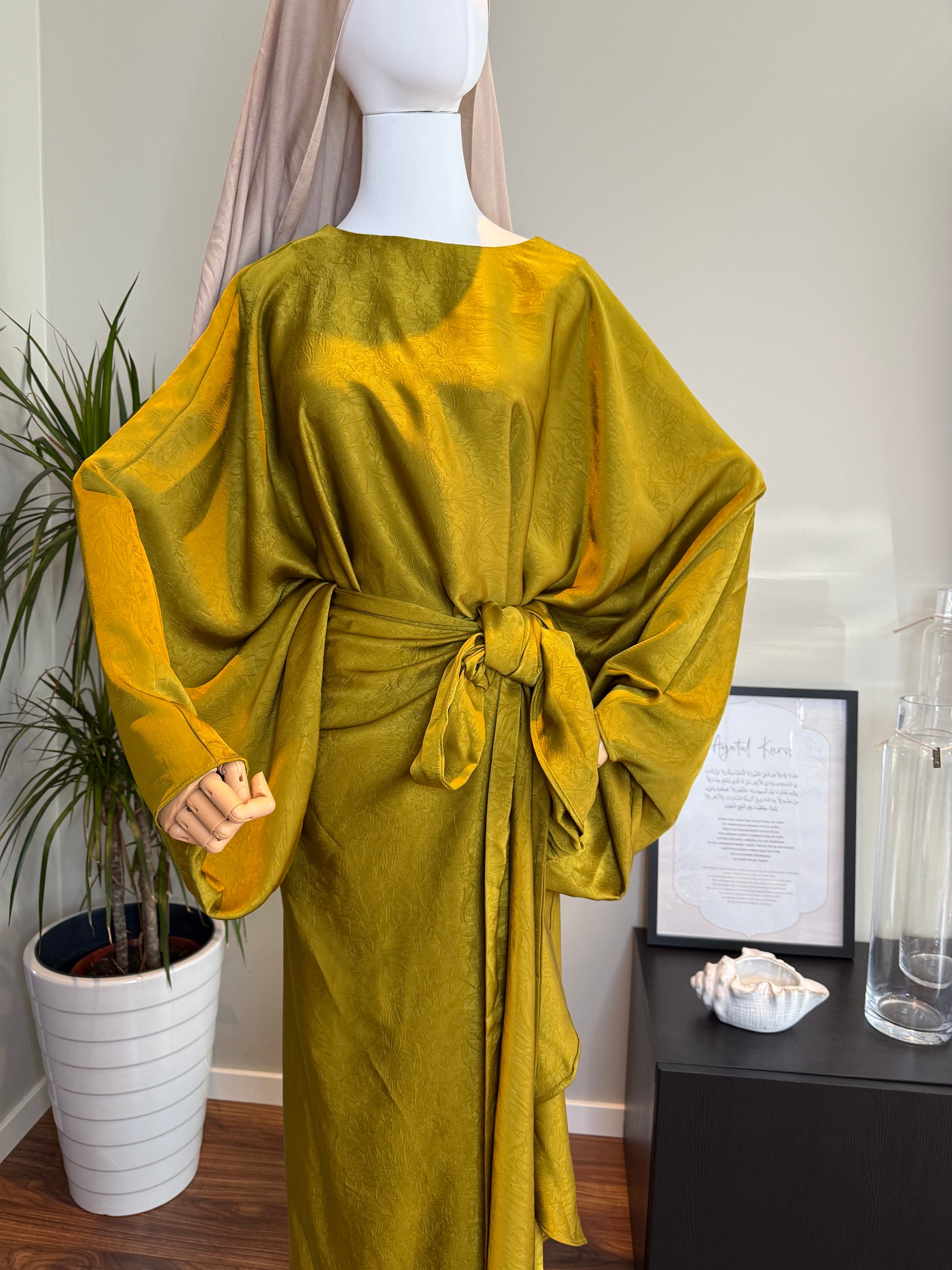Möt sommaren med Lumina set. Kjolen knyts smidigt i sidan och är lätt, luftig och följsam men med exklusiv känsla och vacker drapering. Till kjolen kommer en matchande blus i samma skimrande guldton med en hint av grönt. Blusen har en lös passform med vida, dramatiska ärmar. Ärmarna är designade med en diskret öppning för handen, vilket gör att ärmen sitter på plats och inte faller hela vägen ner när du lyfter armen