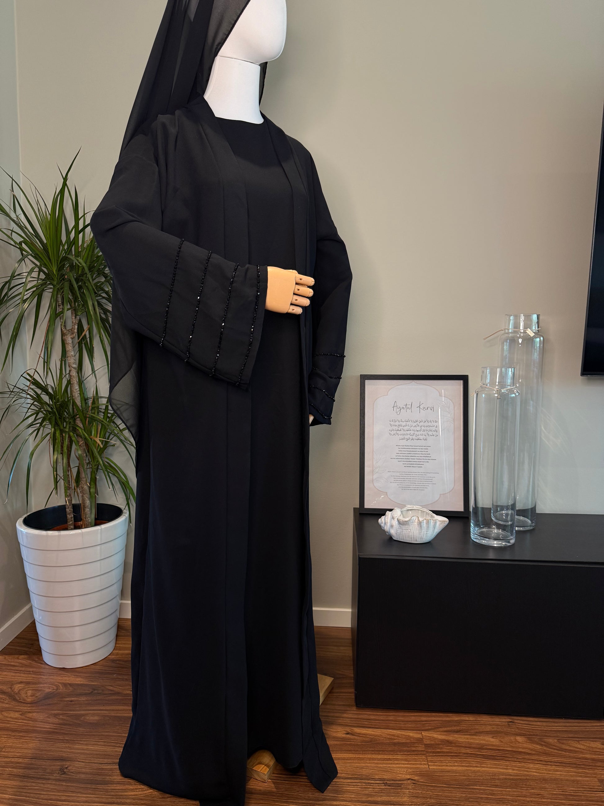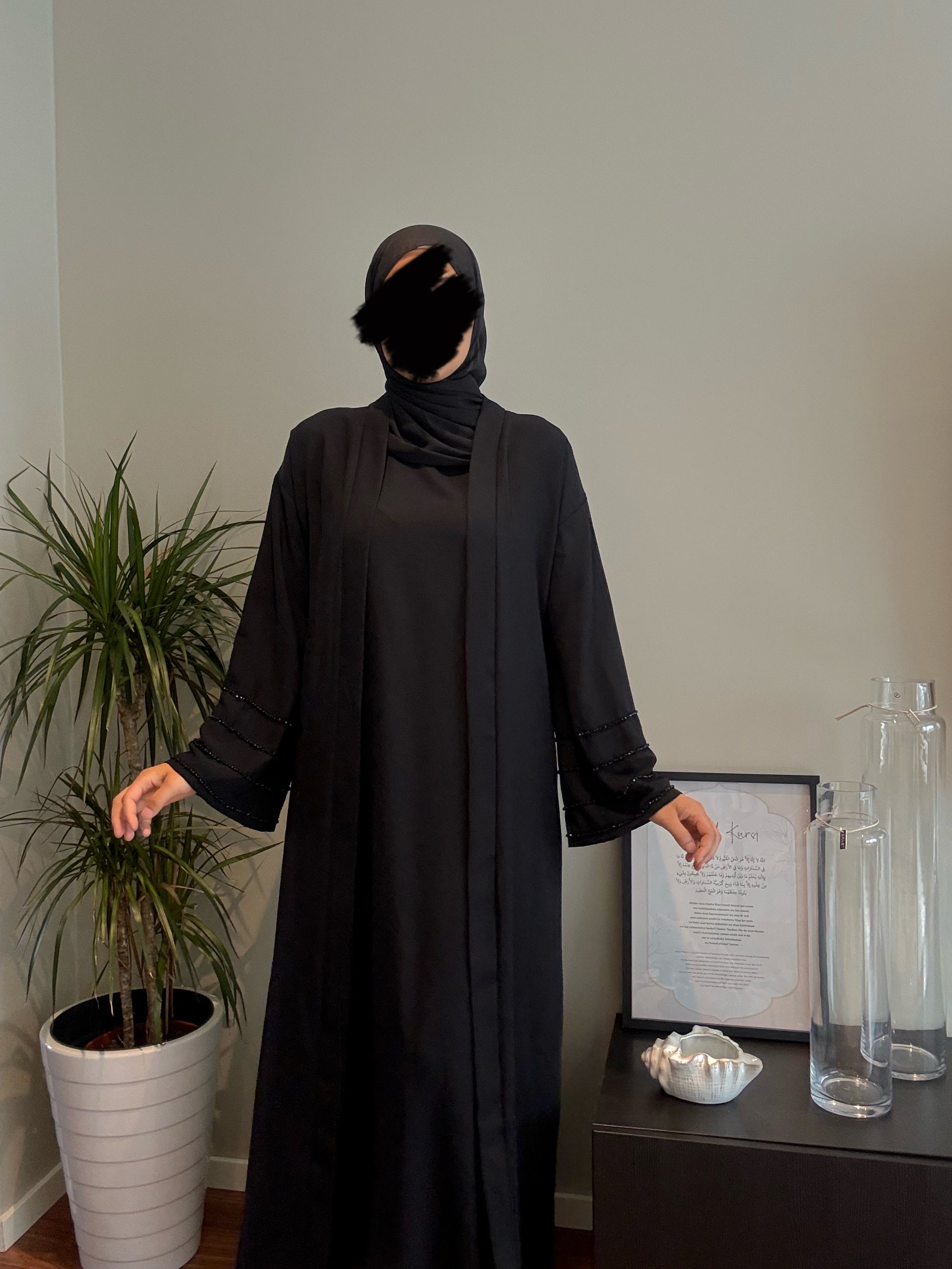 Den öppna abayan har vackra svarta pärlor broderade längst ärmsluten. De vida ärmarna bidrar till ett elegant fall och luftig komfort. Ett avtagbart band medföljer för dig som vill markera formen eller låta abayan bäras öppen för en mer avslappnad look.