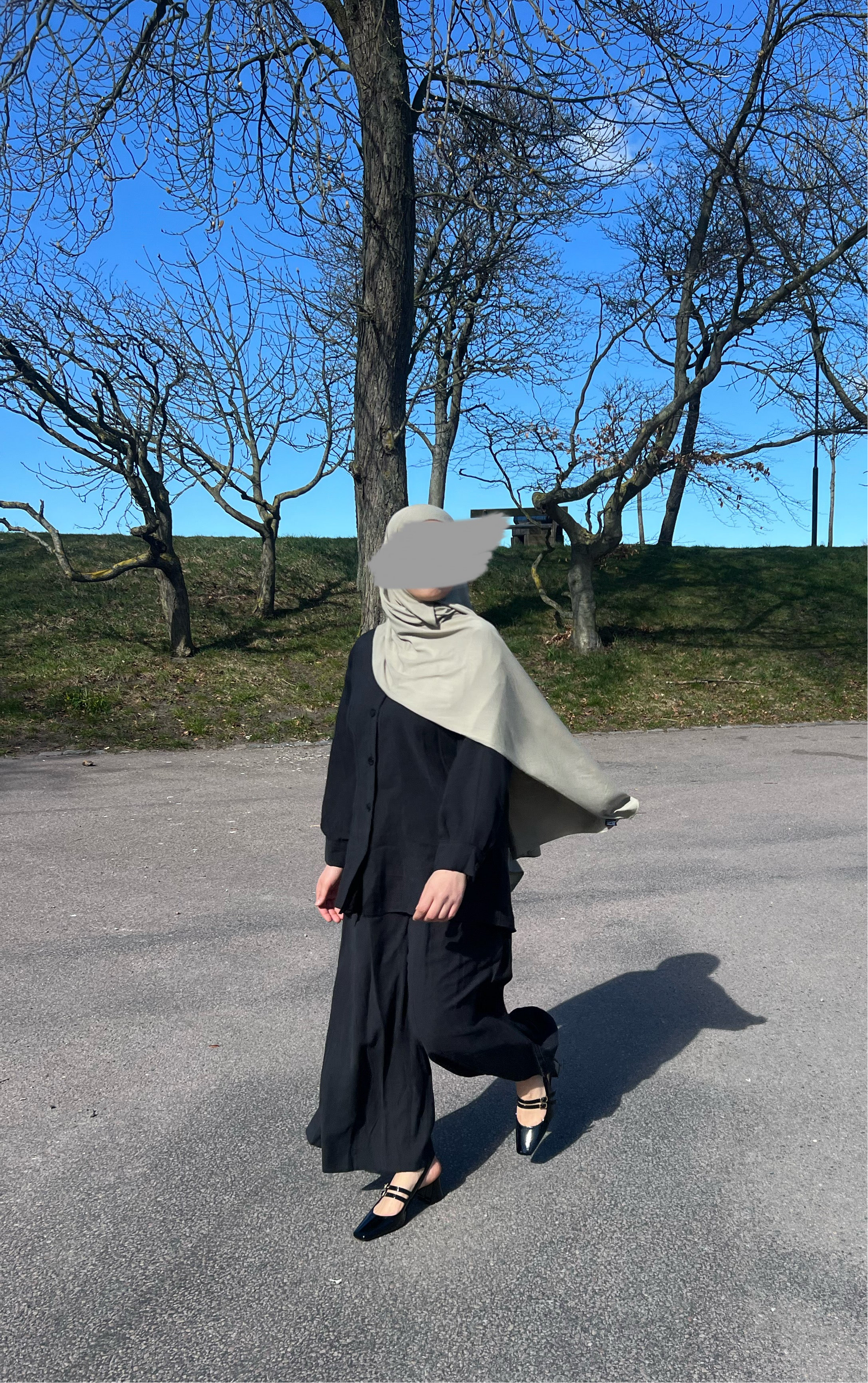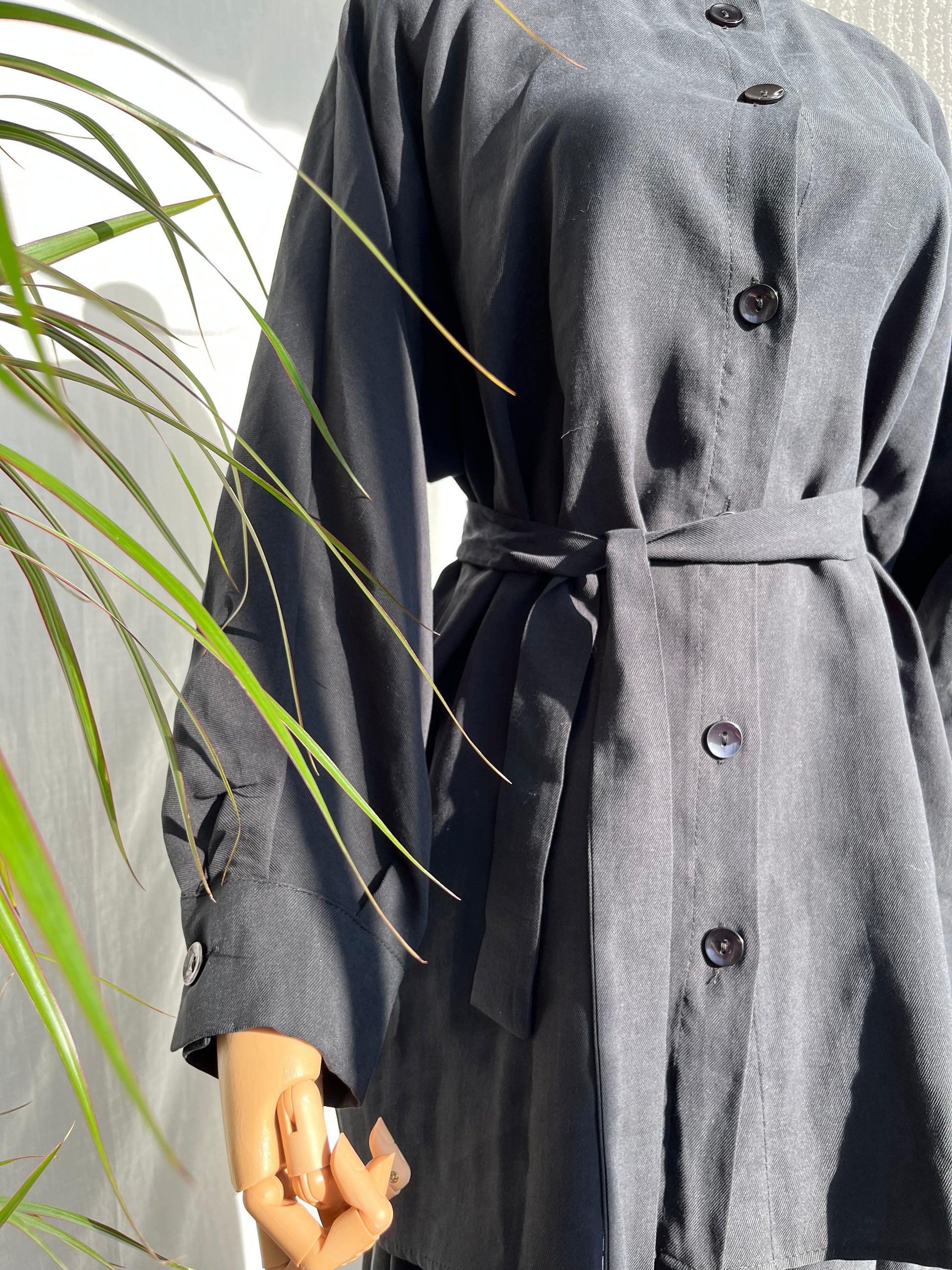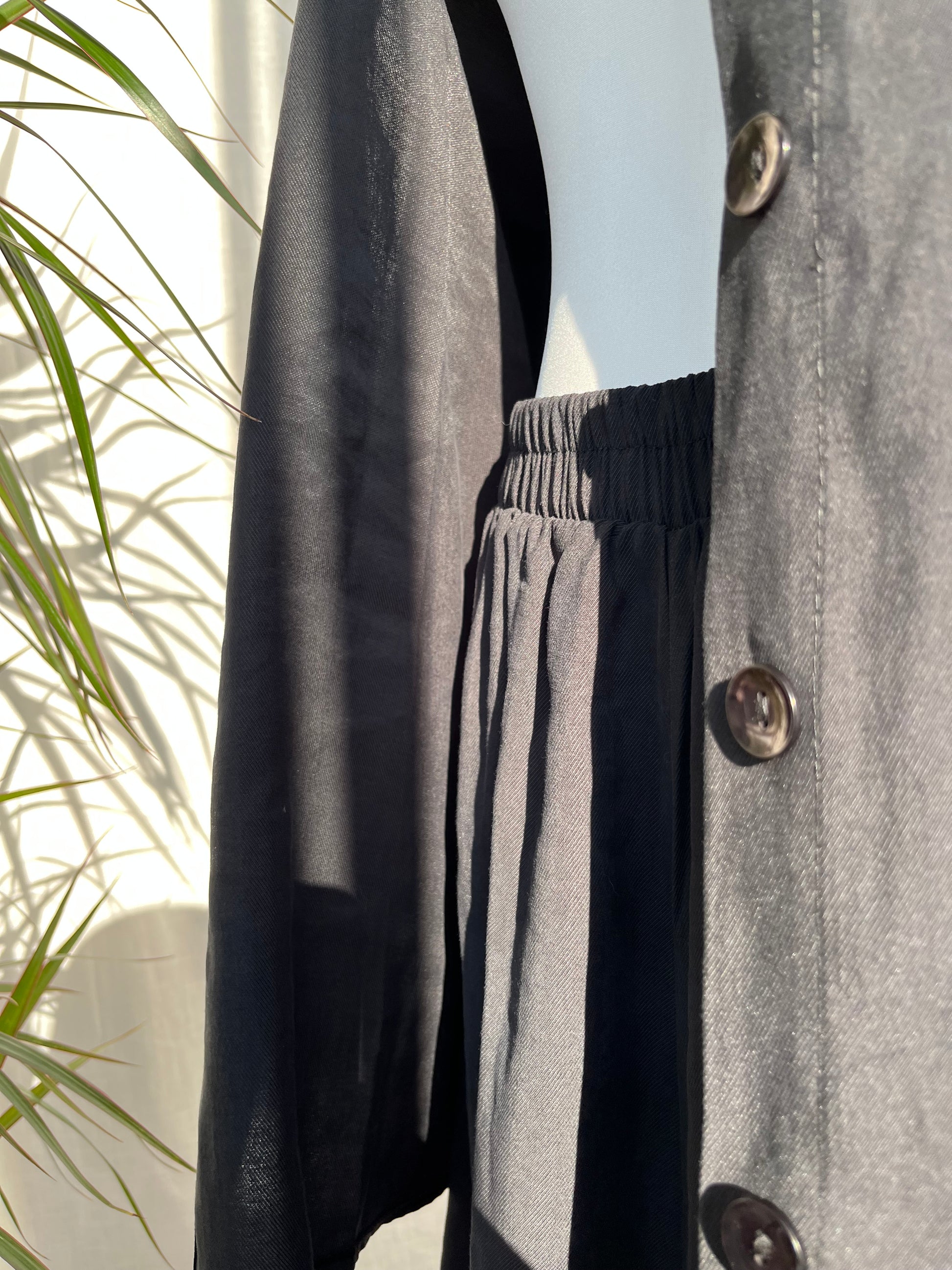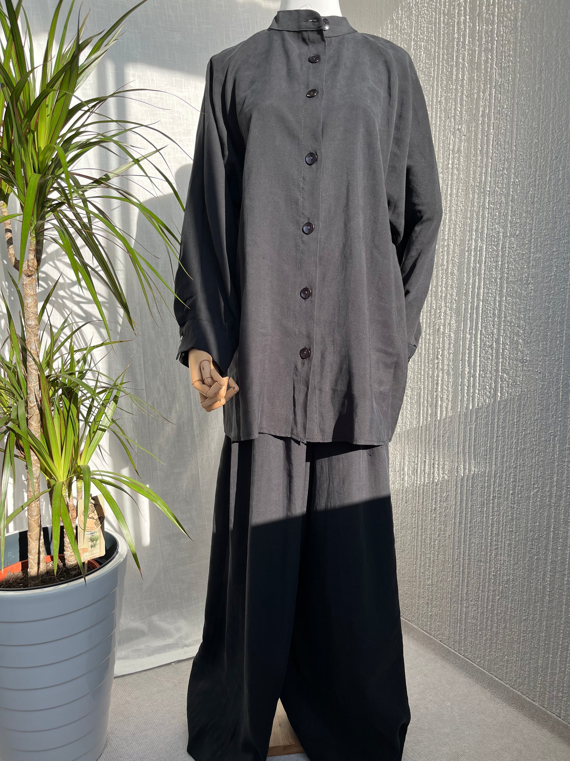 Detta svarta set består av vida byxor och en skjorta med knappar, vilket ger en enkel men stilren look. Setet är både bekvämt och praktiskt, perfekt att slänga på sig för en snygg vardagsoutfit. Om du vill ha extra definition kan det matchas med ett bälte, som ingår i setet och kan användas till skjortan för en ännu mer anpassad stil.